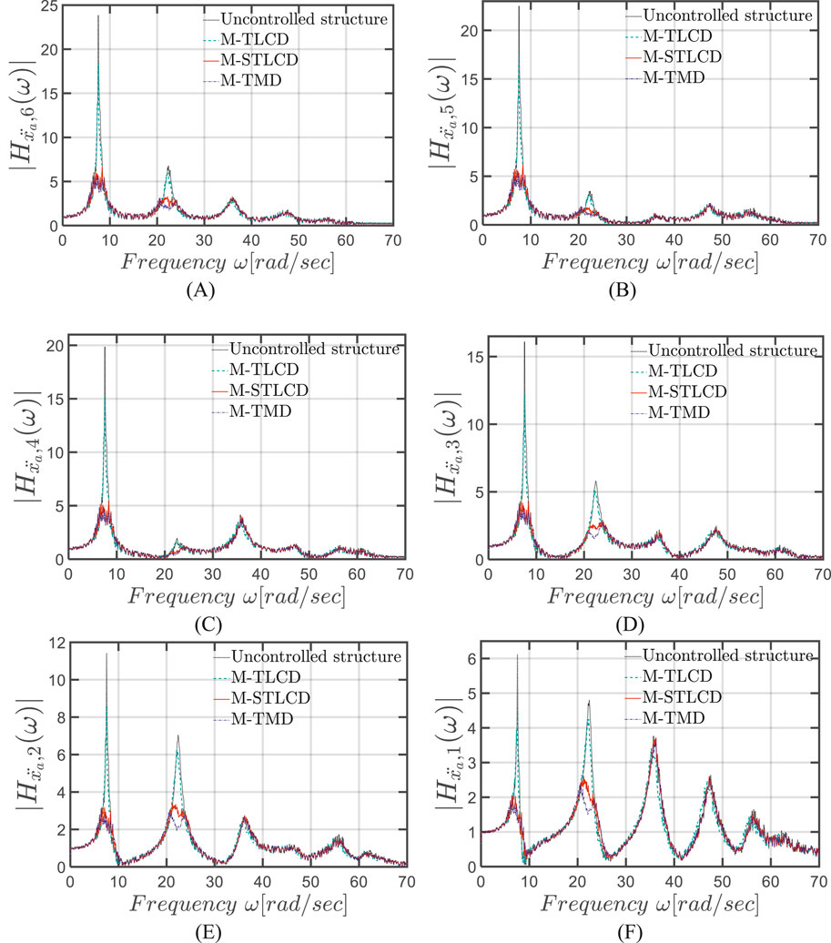 Figure 15. FRFs in terms of absolute accelerations in the final configuration at the: (A) 6th; (B) 5th; (C) 4th; (D) 3rd; (E) 2nd; (F) 1st floor of the six-story structure: M-STLCD vs. M-TMD and M-TLCD.