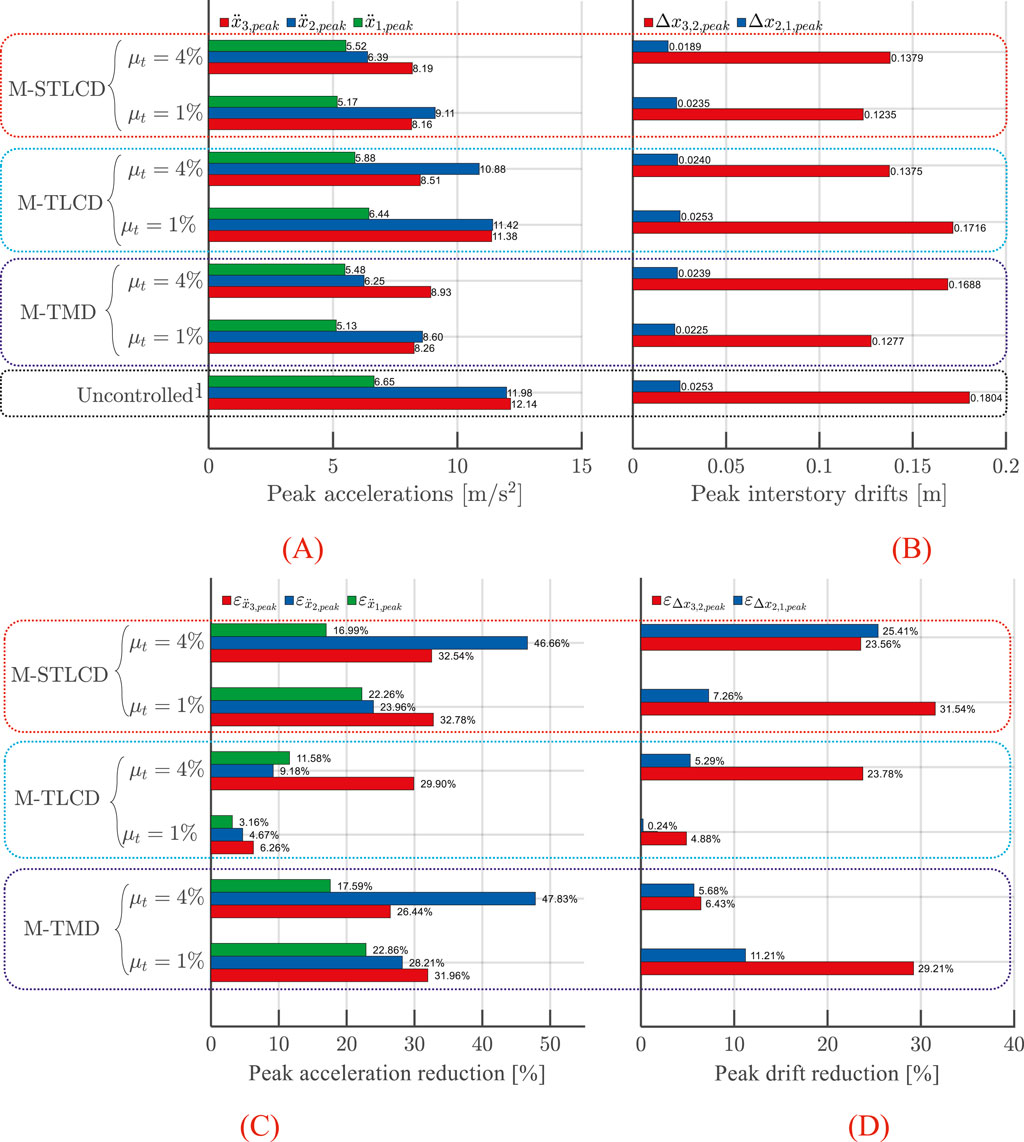 Figure 17. (A) Peak floor accelerations; (B) interstory drifts; (C) acceleration reduction; (D) drift reduction in the three-story structure: M-STLCD vs. M-TMD and M-TLCD control strategies under broadband noise excitation.
