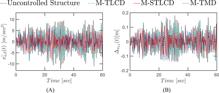 Figure 18. Time-history response of the three-story structure equipped with M-STLCD, M-TMD, and M-TLCD, each having a mass equal to 4% of the total structural mass, subjected to broadband noise excitation: (A) top floor absolute accelerations; (B) interstory drift.