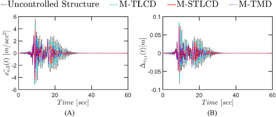 Figure 19. Time-history response of the three-story structure equipped with M-STLCD, M-TMD, and M-TLCD, each having a mass equal to 4% of the total structural mass, subjected to a real earthquake record (1999 Kocaeli): (A) top floor absolute accelerations; (B) interstory drifts.
