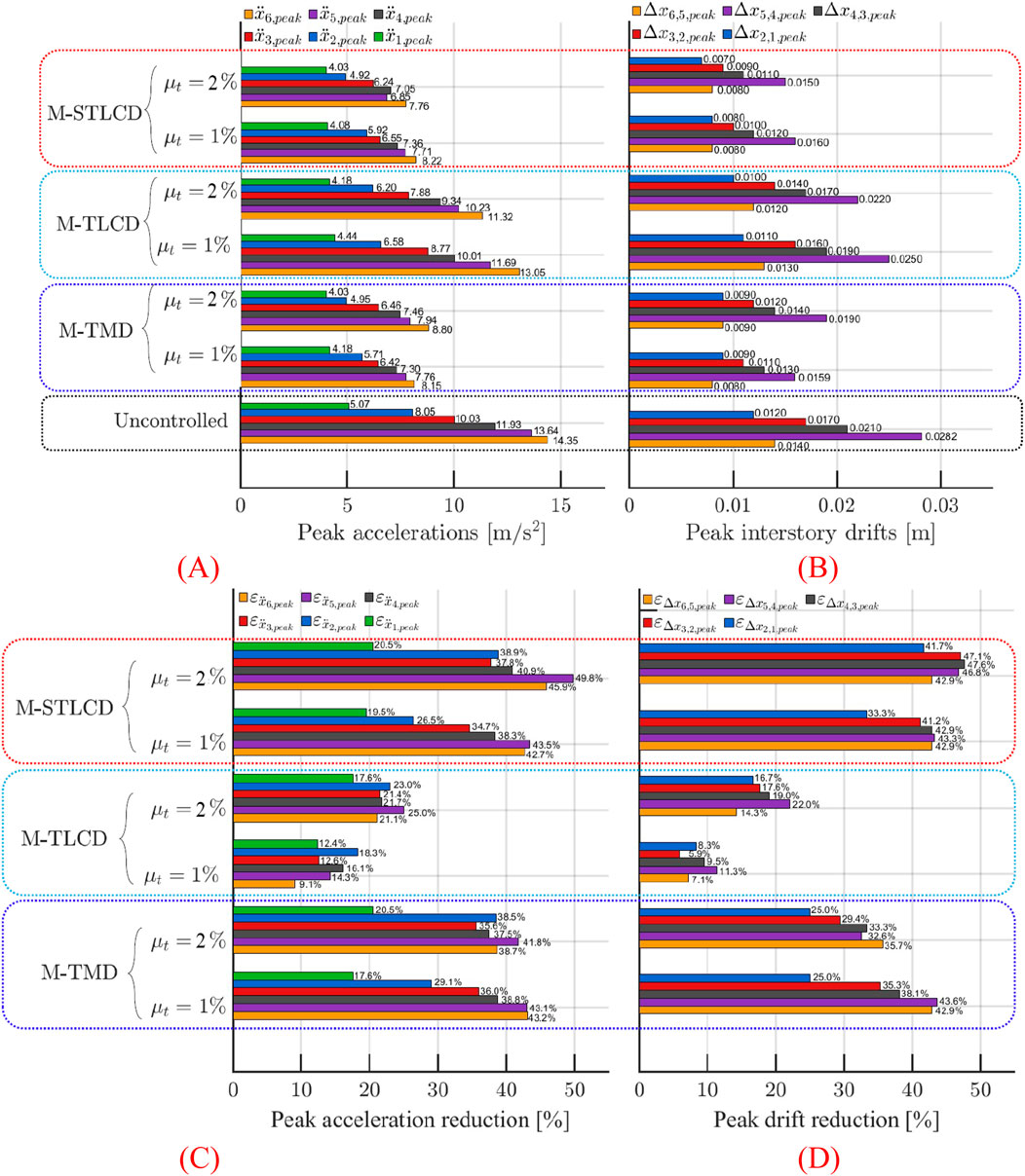 Figure 20. (A) Peak floor accelerations; (B) interstory drifts; (C) acceleration reduction; (D) drift reduction in the six-story structure: M-STLCD vs. M-TMD and M-TLCD control strategies under broadband noise excitation.