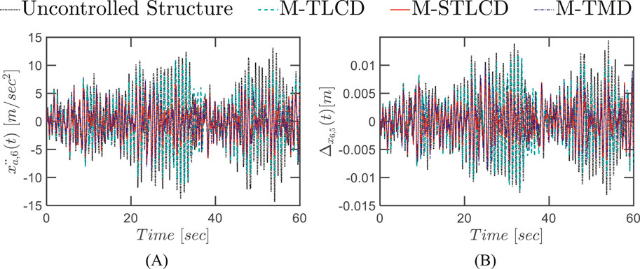 Figure 21. Time-history response of the six-story structure equipped with M-STLCD, M-TMD, and M-TLCD, each having a mass equal to 2% of the total structural mass, subjected to broadband noise excitation: (A) top floor absolute accelerations; (B) interstory drifts.