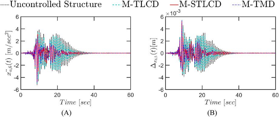 Figure 22. Time-history response of the six-story structure equipped with M-STLCD, M-TMD, and M-TLCD, each having a mass equal to 2% of the total structural mass, subjected to a real earthquake record (1999 Kocaeli): (A) top floor absolute accelerations; (B) interstory drifts.