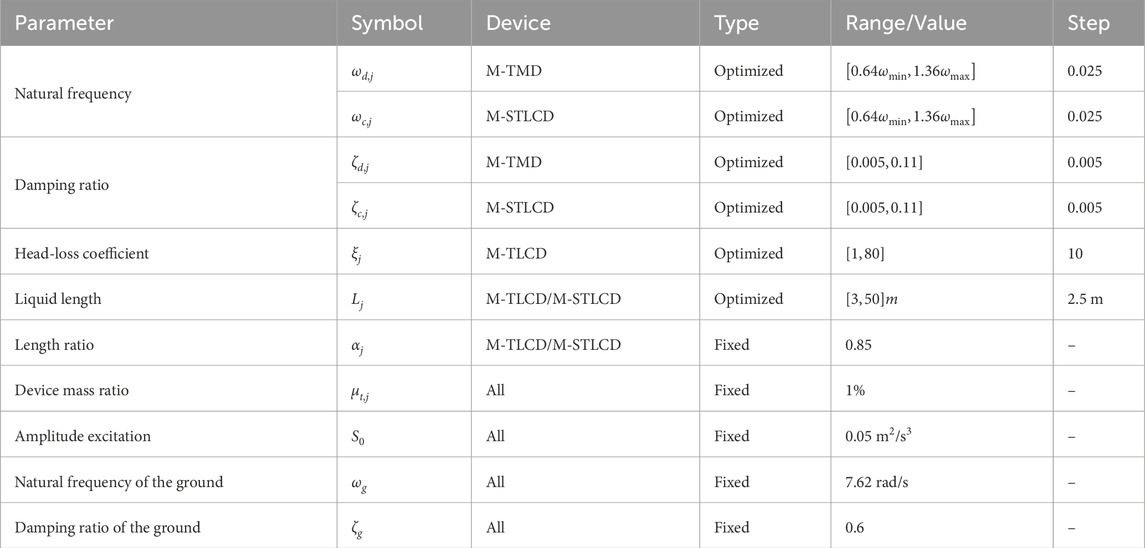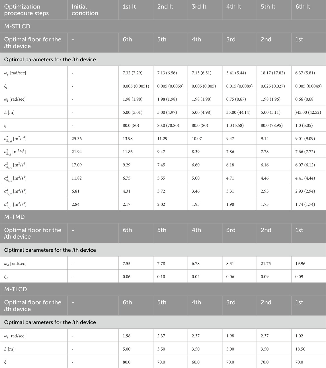 Table 3. Optimized parameters, installation floors, and tuned modes for the M-STLCD, M-TMD, M-TLCD-controlled six-story structure.