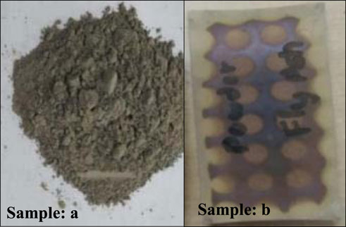 In recent decades, the integration of waste materials into ceramic tile production has been prevalent to improve stability and characteristics while fostering sustainable manufacturing through the use of waste materials, especially fly ash (Yuan et al., 2023). Further, numerous studies concentrate on the characterisation and application of various alternative fluxing agents due to the increased cost of feldspars and the scarcity of proper deposits (Schabbach et al., 2012). The use of waste-derived materials, as alternative raw inputs, also adds value by enabling the productive management of readily available industrial residues, thereby contributing to circular resource flows in material production (Gronba-Chyła et al., 2024). Fly ash, a waste product of coal power generation, is characterized by its gray color, a lump size ranging from 0–5 mm (5 mm sieve), a shrinkage of 6.89%, a Loss of Ignition (LOI) of 4.89%, and a water absorption rate of 18.74%. These properties were considered for this study, where the physical appearance of the fly ash and the test samples (referred to as cookies) is shown in Figure 3. The cookies represent disc-shaped specimens made from the fly ash, which were used to determine relevant characteristics, present in Table 1.