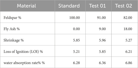 Table 1 summarizes the material composition and fired properties of ceramic bodies with varying percentages of fly ash (0%, 9%, and 18%). The study observes changes in shrinkage, loss of ignition (LOI), and water absorption rates as fly ash content increases, while feldspar content proportionally decreases. Based on the observed properties, Test 01 (9% replacement of fly ash) has been identified as the optimal scenario for proceeding with the eco-alternative solution due to its favorable results as the successful test by the manufacturer.
