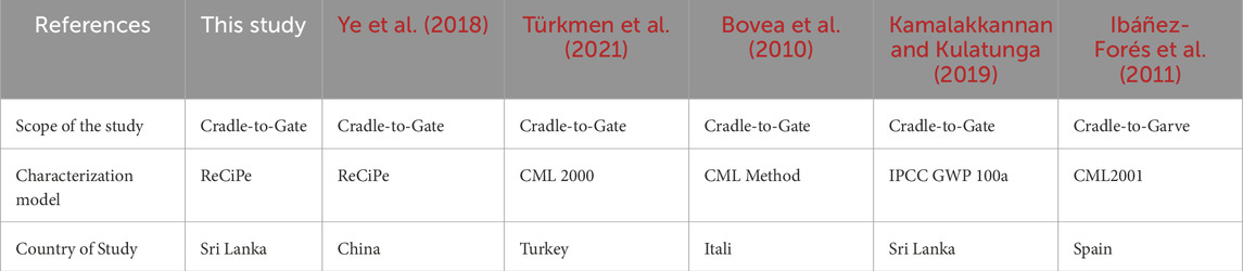 This section presents an overview of previous studies on ceramic tile production (per m2). Table 7 outlines the methodological frameworks and geographical contexts of the chosen studies on ceramic tile manufacturing. The studies varied in their selection of impact assessment models, indicating variations in methodological preferences or geographical priorities. The geographic variation between countries like Sri Lanka, China, Turkey, Italy, and Spain can substantially affect the environmental impact outcomes due to discrepancies in energy sources, raw material accessibility, technological advances, and regulatory frameworks.