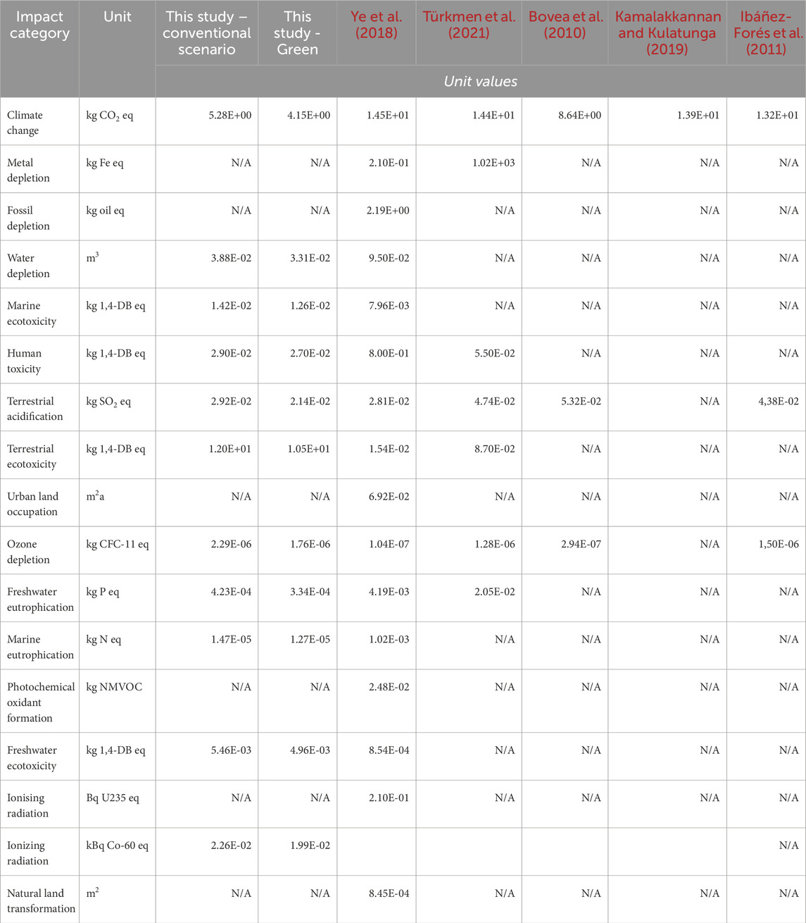 In the study of Türkmen, Duhbacı, and Özbilen (2021), electricity and natural gas were identified as the primary energy sources utilized in the production of glazed ceramic tiles. The results demonstrate that the production of 1 m2 of ceramic tile necessitates an energy input of 221 MJ, yielding a global warming potential (GWP) of 14.4 kg CO2 equivalent per m2 of glazed ceramic tile. The production stage, noted for its significant energy use, is identified as the principal hotspot contributing to most environmental impact categories evaluated in this study. According to a study of Bovea et al. (2010), the hydrocarbons generated from the combustion of natural gas and diesel, along with the emissions of SOx (4.44E-05 mg/m2 compared to 1.04E-06 mg/m2 in this study), released during the production of electrical power used by the machinery, are the main factors contributing to the higher acidification impact observed in this study. This pattern highlights the significant influence of fuel combustion and power generation on the acidification potential of the production process (Bovea et al., 2010). Furthermore, Ye et al. (2018), highlighted that the relatively higher environmental impact observed in Bovea et al. (2010) study can be attributed to the older and less efficient production technologies used during that period. The high impact observed in Kamalakkannan and Kulatunga (2019) study is likely due to the higher energy consumption (6.248 kWh/m2 for raw material mixing to final product firing), which is considered for comparison. In contrast, this study consumes 4.66 kWh/m2 for the same process, with no major changes in other input categories compared to Kamalakkannan and Kulatunga (2019) study. The research conducted by Ibáñez-Forés et al. (2011), emphasizes the atomization phase of ceramic tile production as the most significant across all environmental metrics, primarily attributable to the substantial natural gas usage required for the drying (7.04 kWh/m2) and firing (10.86 kWh/m2) processes, coupled with the resultant emissions of pollutants including CO, NOx, and SOx, underscoring this phase as a pivotal target for mitigating the overall environmental repercussions of ceramic tile manufacturing. The increased environmental impacts noted in that study are probably due to the substantially increased natural gas consumption (35.39 kWh or 4.95 L/m2) in contrast to the 1.47 L/m2 utilized in the present study.