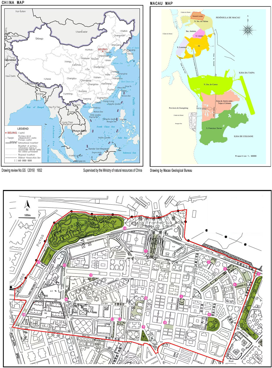 Figure 1. Regional map of Macau, China, and distribution of green spaces in research areas, adapted from the Municipal Affairs Bureau of Macau (2022).