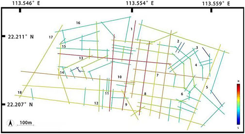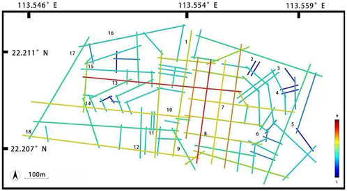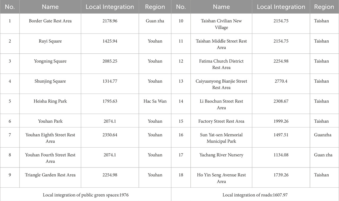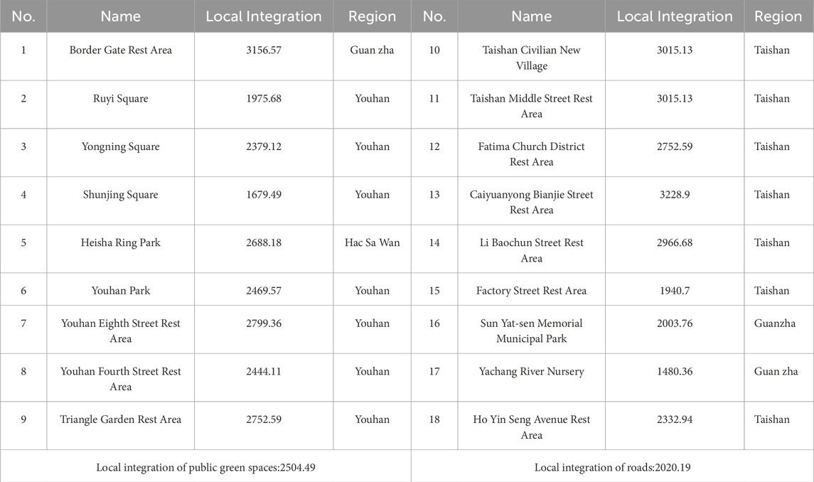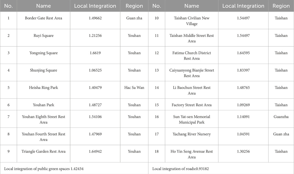 This study will analyze the local accessibility of 18 public green spaces in Youhan and Taishan communities in Macau through local accessibility, which in spatial syntax indicates the connection between a node and nearby nodes within a few steps (i.e., the higher the local accessibility, the higher the local scope is also the center of people’s activities within the spatial scope of the local scope) (Zhou and Wang, 2023). Public green spaces serve as recreational areas for older people, children, and community residents. Therefore, in the setting of local integration indicators, the walking range is the main focus, and the “radius 3” integration degree is selected as an example of the road network system for spatial local integration analysis to identify whether green spaces can become local activity centers within a “5-10 minute walking circle” of high-density communities in Macau, and to solve the problem of “service blind spots in high demand areas. There is a high local accessibility green space around Taishan Civilian New Village (Sun and Luo, 2024).