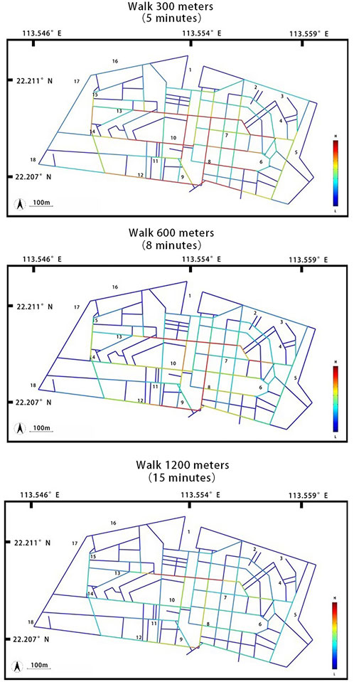 The first step in the degree of choice analysis is to set the parameters. This study used a tracking survey based on the establishment of the three walking parameters of 300 m, 600 m, and 1200 m (Li, 2017). These parameters evaluate the efficiency of green space services for different usage scenarios of Macau residents: 300 m (for daily grocery shopping and rest), 600 m (for evening walks), and 1200 m (for weekend leisure). Then, whether the green space covers high-frequency usage paths is evaluated. The selectivity of Youhan and Taishan neighborhood streets under different parameters is obtained through the Depthmap operation and is shown in Figure 7. The spatial syntax operation follows Huang Z et al. (2024). The calculation follows as Equation 3: