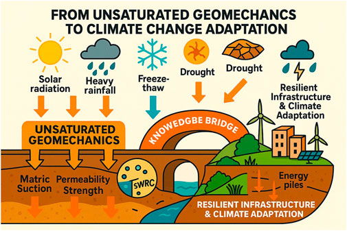 Climate change is reshaping the frequency, intensity, and duration of weather events globally. In many regions, particularly those under tropical climates with residual soils, slope failures are increasingly triggered by climate-driven events such as prolonged droughts, extreme rainfall, and rising temperatures, which are no longer isolated anomalies but part of an increasingly volatile climate system (Vardon, 2015; Yasuhara and Bergado, 2022; Costa et al., 2023; Kandalai et al., 2023; Bridges, 2024). For example, climate change has significantly altered rainfall patterns, leading to more intense storms occurring less frequently. This shift, coupled with increased atmospheric temperatures and moisture capacity, results in extreme rainfall events that greatly affect slope stability (Au, 1998; Toll et al., 2008; Loveridge et al., 2010; Rahimi et al., 2011; Scaringi and Loche, 2022). Specifically, in tropical regions, intense rainfall infiltration reduces matric suction in residual soils, diminishing shear strength and making slopes more prone to failure. In contrast, arid and semi-arid regions face challenges associated with collapsible or dispersive soils, where wetting after prolonged droughts can induce sudden settlement or erosion. These diverse regional contexts highlight the universal applicability of unsaturated soil mechanics while underscoring the need for tailored design and adaptation strategies. These phenomena significantly affect the behavior and performance of geotechnical infrastructures (Salimi and Al-Ghamdi, 2020; Pantoja Porro et al., 2025).