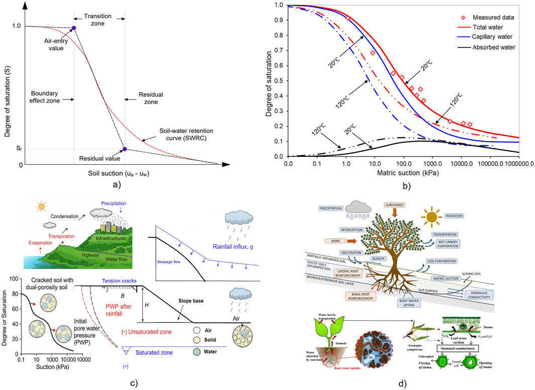 The importance of unsaturated soil mechanics stems from its crucial role in understanding and mitigating the impacts of climate change, particularly in response to rainfall variability and extreme weather events (Fredlund, 2006; Fredlund, 2014; Houston, 2019; Lu, 2020). As shown in Figures 2a, as patterns of precipitation and evaporation shift, soils are subjected to more frequent wetting–drying cycles, leading to fluctuations in matric suction, effective stress, and shear strength. These changes significantly influence the stability and performance of slopes, foundations, and earth structures. Since unsaturated conditions dominate the vadose zone—where climate-sensitive hydrological and geotechnical processes interact—integrating unsaturated soil behavior into design and risk assessment is essential for ensuring climate-resilient infrastructure.