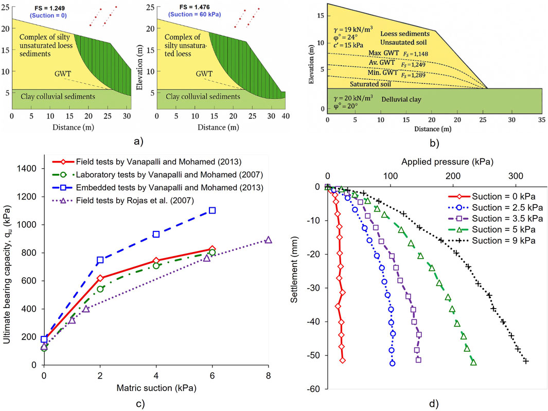 As shown in Figure 4c, several experimental studies (Vanapalli and Mohamed, 2007; 2013; Rojas et al., 2007; Pham and Sutman, 2022b) have demonstrated that the ultimate bearing capacity of shallow foundations increases with increasing matric suction. However, infiltration from rainfall or a rising groundwater table tends to reduce suction, which in turn can lead to a decrease in bearing capacity.