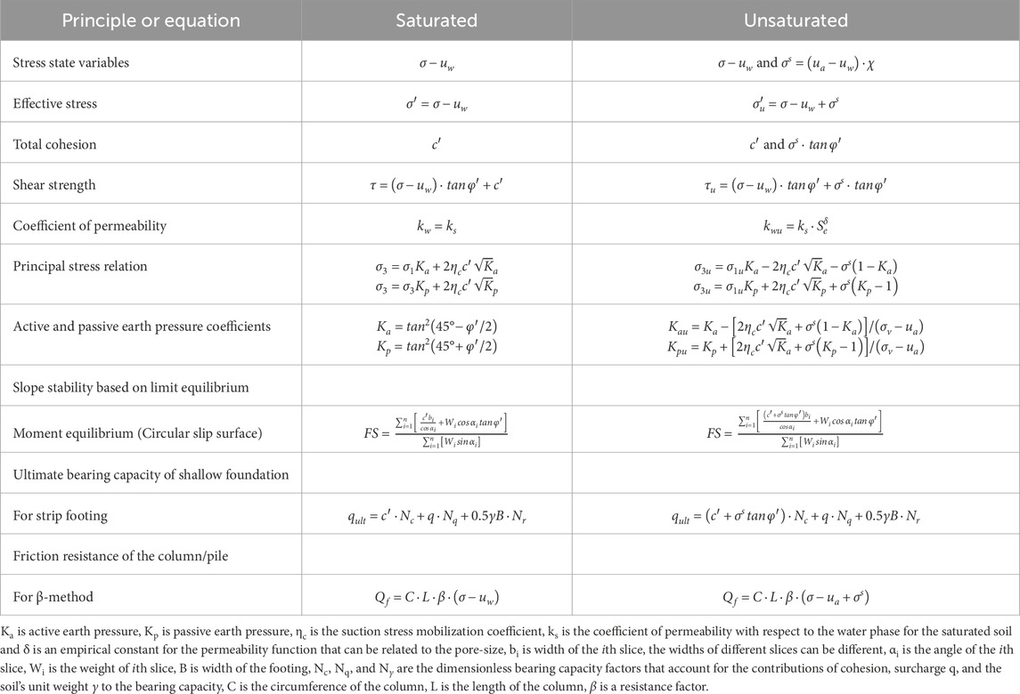 The influence of unsaturated soil mechanics on infrastructure design and performance becomes particularly significant under climate-induced moisture fluctuations. In this study, four case studies are investigated and presented. Table 1 summarizes the fundamental differences between saturated and unsaturated soils and introduces extended formulations for selected engineering applications in geotechnical engineering.