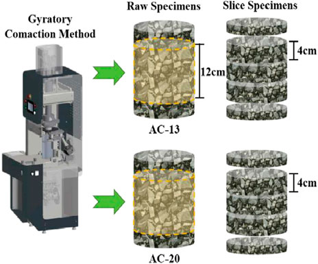 This study employed SBS-modified asphalt binder and limestone aggregates to prepare the DGAC specimens. As aforementioned, both nominal maximum size of aggregate (NMSA) and compaction efforts are considered in this study. Thus, two common aggregate gradations (AC-13 and AC-20, see Figure 1) and three kinds of compaction cycles (50, 75, and 100) are designed to obtain distinctive specimens. The gyratory compaction method is used to prepare the cylinder specimens with a 100 mm diameter and 150 mm height. In order to ensure the relative uniform distribution of pore structures, both ends part within 15 mm height are removed. Besides, considering the inhomogeneous distribution features of pore structures, the testing specimens with different heights are fabricated by a cutting machine, a specific process, as shown in Figure 2.