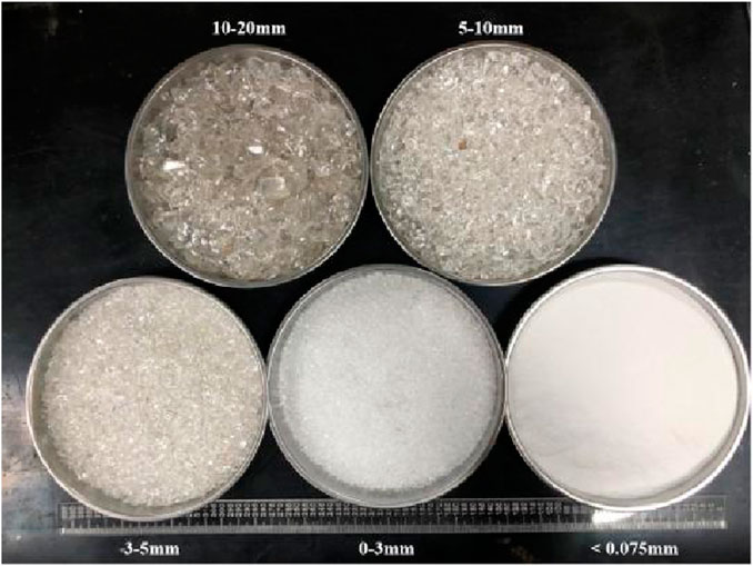 The polished crystal crushed stone is a kind of aggregate particle with excellent transparency, which has similar physical properties to mineral aggregates (density is 2.6 g/cm3, see Figure 4). The refractive index of the selected crystal in this study is 1.558, which is measured by an Abbe refractometer. Considering the cohesive force of binder materials, epoxy glue is selected to replace asphalt binder, which shows a similar refractive index (1.542) to crushed crystal stone. For the preparing of TDGAC, identical aggregate graduation was adopted to ensure the TDGAC has similar internal structural characteristics with the DGAC (see Figure 1). It should be mentioned that considering the shape characteristics and convenience of the TDGAC specimens, we used the wheel rolling method instead of the gyratory compaction method. Both compaction methods are followed by the Chinese specification “Standard Test Methods of Asphalt and Asphalt Mixture for Highway Engineering”, ensuring that the specimens prepared by the two methods have similar structural characteristics. Besides, in order to prevent the problem of difficult demolding for TDGAC, a layer of silicone film is laid around to avoid the epoxy glue from adhering to the iron mold.