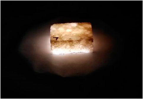 Due to the similar transparency of water and crushed stone, it is difficult to observe the moisture migration process in the internal structure of TDGAC. Therefore, the mixture of blue ink (moisture content above 90%) and medical Iodophor solution (effective iodine content of 4.5–5.5 g/L) was selected as the permeable liquid, and its main component was still water, which only affected the migration rate of the solution without changing the direction of migration. For visualization of the permeation process, using light transmission method was developed to enhance visualization of permeation results, see Figure 5.