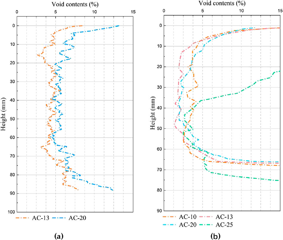Figure 6a illustrates the air void distribution patterns of AC-13 and AC-20. It can be drawn that two kinds of mixtures present a “bathtub” feature, which shows both end parts (top/bottom 2 cm) have more air voids, while the middle part has limited amounts. Specifically, the AC-20 displayed 2%–6% higher void content than AC-13 within the terminal parts, while the middle part maintained a narrower differential below 2%. These results imply that the structure at the end positions is relatively more difficult to compact for the asphalt mixtures with NMAS. These findings are similar to Kutay’s investigation (Wen et al., 2011). As shown in Figure 6b, the results confirm that mixtures with larger NMAS tend to develop higher void concentrations under identical compaction conditions, especially for the terminal parts. Although the NMAS affects the total air void contents of DGAC with identical compaction efforts, it shows similar void contents distribution characteristics. It can be seen that the research conducted in this study on the void ratios of DGAC has a general regularity.
