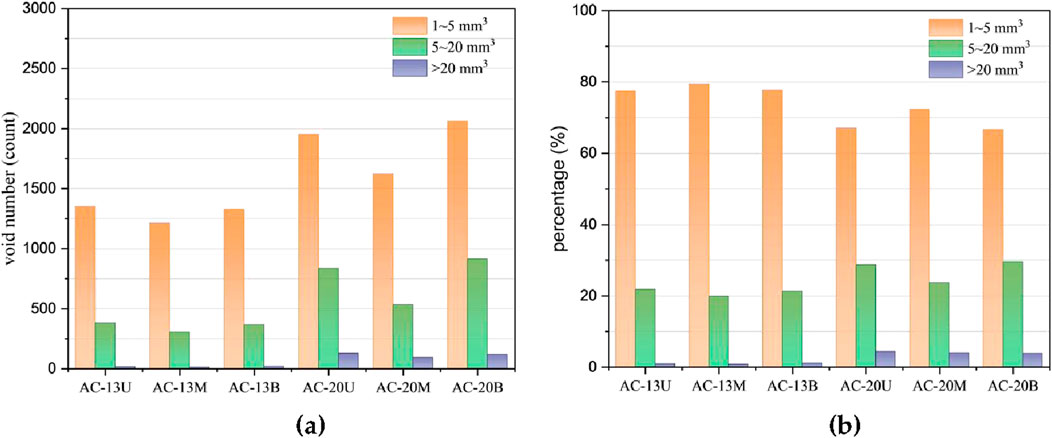The void counts indicate the absolute value of the distribution characteristic at different positions. Analyzing the proportion of different void volume scales can clearly define the composition characteristics of the voids in asphalt mixtures at different positions. Figure 7b reveals distinct spatial patterns in void size distribution. Small voids dominated the central regions, constituting approximately 80% of total voids, while their proportion decreased to 60%–70% in the terminal sections. Conversely, medium and large voids exhibited an inverse trend, accounting for 20%–30% of voids at the top and bottom regions but less than 20% centrally. This phenomenon arises from the denser compaction in the middle regions, which fragments larger voids into amounts of smaller void particles. The comparative analysis highlights gradation-dependent characteristics. For AC-13, small voids comprised 70%–80% of total voids, whereas AC-20 exhibited a lower proportion (60%–70%), accompanied by a 10%–15% increase in medium/large voids. These findings confirm that mixtures with larger NMAS, such as AC-20, inherently develop more interconnected medium-to-large voids under equivalent compaction energy, directly contributing to their elevated overall void contents.
