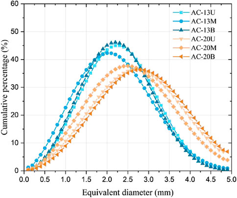 The analysis of void volume distribution demonstrates that the NMAS governs both the volumetric scale and equivalent diameter characteristics of internal voids in asphalt mixtures. The equivalent diameter of the air void is a metric used to quantify the size of irregular void particles in asphalt mixtures, which is an important parameter that determines the ease of flow characteristics of NMAS. By converting geometrically complex voids into an equivalent spherical diameter. To investigate the gradation-dependent variations in equivalent diameter of voids, the equivalent void diameters of AC-13 and AC-20 specimens were calculated using the equivalent diameter methodology (Sun et al., 2023), which is expressed as Equation 3: