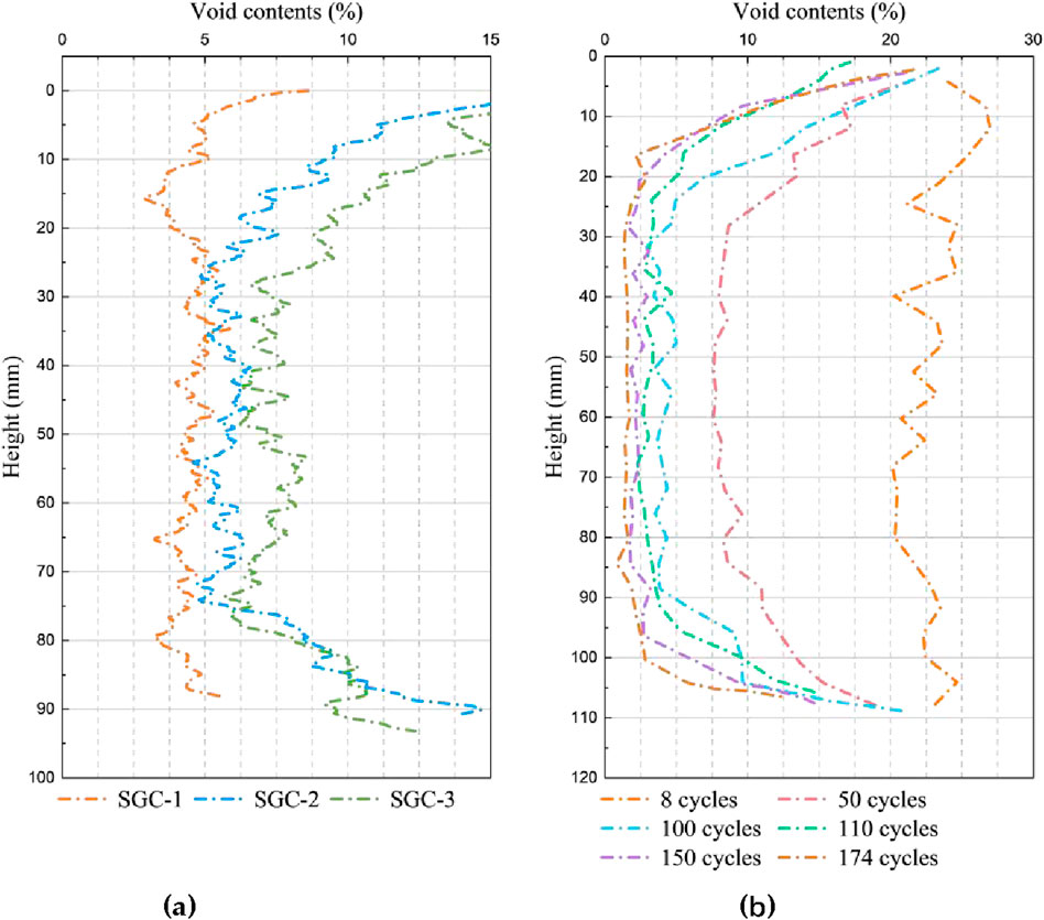 Figure 6b presents the findings of Masad’s (Masad, 2004) study on the relationship between gyratory compaction cycles and void distribution trends. Overall, the studies identify a critical threshold (8–40 cycles) beyond which void contents stabilize into a characteristic “bathtub” profile along the vertical direction, with uniform central regions. As compaction energy increases, the uniformity of void distribution expands, eventually reaching a saturation point (150 passes in the cited reference) where further compaction yields negligible changes. Although the absolute number of passes required to achieve equivalent void content differs between studies—attributed to variations in material properties, specimen geometry, gradation, and compaction parameters—the fundamental trend remains consistent. This underscores the dominant role of compaction energy in governing void structure evolution, irrespective of specific experimental conditions. The combined evidence highlights the necessity of optimizing compaction protocols to balance structural integrity and material efficiency in asphalt pavement construction.