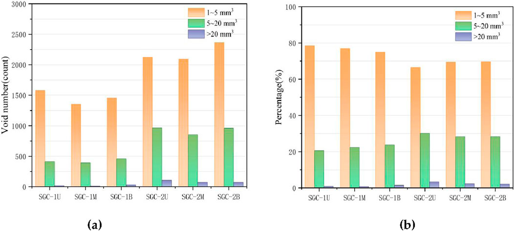Figures 10a,b present the pore volume distribution and corresponding pore density along the vertical direction at different volume scales. It should be noted that the analysis in this section is based solely on specimens SGC-1 and SGC-2. Analysis of Figure 10a reveals two consistent patterns: 1) a significant negative correlation exists between the number of pores and pore volume; 2) the pore density at both ends of the specimens is markedly higher than in their central regions. Specifically, the total number of pores in specimen SGC-1 is approximately 2000, compared to about 3,200 in SGC-2, indicating that SGC-2 exhibited 37% more total pores than SGC-1. Crucially, for large-volume pores (or medium-to-large pores), the number present in SGC-2 is nearly twice that in SGC-1. This result indicates that increasing the compaction effort effectively reduces the spacing between aggregate particles, thereby forming a denser microstructure.