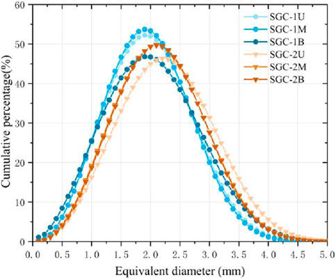 Figure 11 presents the probability distribution curves of equivalent pore diameters for specimens SGC-1 and SGC-2. Note: Light-to-dark blue curves represent the upper, middle, and lower sections of SGC-1, respectively, while orange curves denote the corresponding sections of SGC-2.