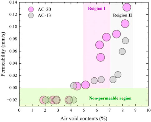 As a kind of porous medium material, the permeability characteristics of asphalt mixtures mainly depend on the morphological characteristics and distribution of their internal void structures. Figure 12 illustrates the relationship between permeability coefficient and air void contents for AC-20 (denoted in purple) and AC-13 (denoted in grey) asphalt mixture specimens. To distinguish completely impermeable specimens from the cores, their permeability coefficients were uniformly set to −0.02 mm/s (light green zone). This value serves as an identifier and holds no actual physical significance. Within this range of higher air void content, the permeability coefficient of the asphalt mixtures increases significantly (>0.03 mm/s), indicating susceptibility to rapid water infiltration under a hydraulic gradient. Notably, comparing with previous researches (Ren et al., 2023; Chen et al., 2023), the gradation-dependent permeability pattern was found, the air void content of 5% and 7% represent critical threshold for permeability behavior in AC-13 and AC-20 graduation asphalt mixtures, respectively. Once the void ratio excess this threshold, the permeability coefficient increases exponentially with void ratio. However, this value is not an absolute boundary. Experimental data (e.g., two core specimens of AC-20 with air voids ≈4% exhibited infiltration, and one specimen of AC-13 did so) demonstrate that infiltration exhibits a random nature within the low air void range (e.g., 3%–5%). Comparing these two gradation types, AC-20 specimens exhibited higher permeability coefficients and entered their rapid permeability zone (Purple Zone I) at lower air void content levels. In contrast, AC-13 specimens required higher air void content to reach their corresponding rapid permeability zone (Grey Zone II).