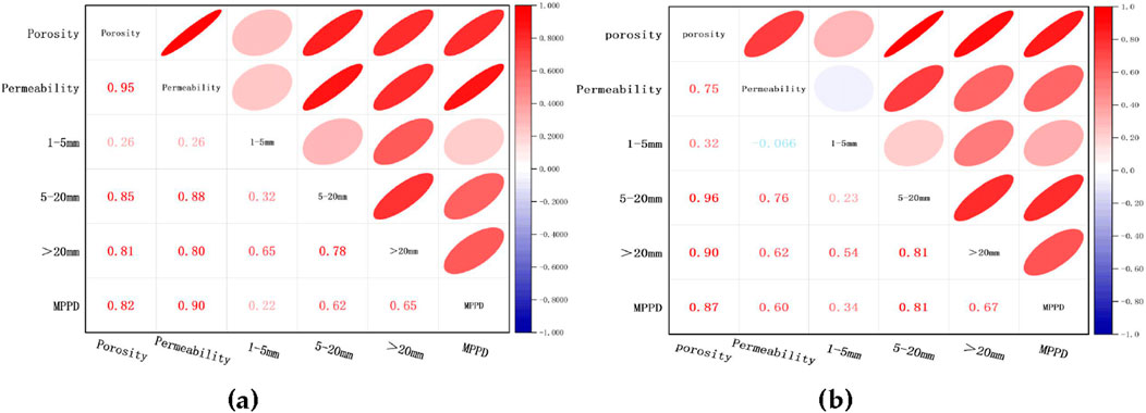 Based on the correlation heatmaps between pore morphology parameters and permeability for AC-20 and AC-13 gradation specimens (Figures 13a,b), this study systematically elucidates the influence of meso-structure on permeability. For AC-20 specimens, the Pearson’s correlation coefficient between permeability coefficient and total void contents reaches 0.950, significantly higher than the value of 0.750 for AC-13. This indicates that the influence of air void contents on permeability intensifies with a larger maximum nominal aggregate size. This finding aligns with the conclusion in Section 3.1.3: the equivalent diameter of AC-20 is approximately 0.6–0.7 mm larger than that of AC-13 (Figure 8), facilitating the formation of connected pore networks. Further analysis of pore scale reveals that in AC-13, large pores (>20 mm) exhibit the strongest correlation with permeability (0.900), while small pores (1–5 mm) show a negative correlation (−0.660). In contrast, for AC-20, medium-sized pores (5–20 mm) demonstrate the most significant correlation with permeability (0.880). This difference can be attributed to gradation characteristics: as described in Section 3.1.2, AC-20 possesses nearly twice the number of medium and large pores compared to AC-13, and their spatial distribution is more conducive to forming continuous flow paths. Notably, although equivalent diameter exhibits a strong correlation with permeability for both gradations (AC-13: 0.870; AC-20: 0.820), compaction significantly weakens this relationship. Section 3.2.3 demonstrates that as the number of gyratory compaction cycles increases from 70 to 100, equivalent diameter decreases from 2.2 mm to 1.9 mm, accompanied by a sharp decline in permeability. In summary, permeability is not solely governed by total air void contents but is predominantly controlled by pore size distribution and connectivity. When air void contents exceeds 5%, the proportion of connected pores larger than 5 mm becomes the critical factor influencing permeability. The maximum nominal aggregate size and compaction energy ultimately determine permeability by altering the morphology and quantity of such pores.