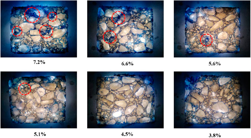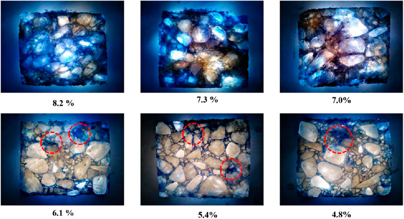 Figures 14, 15 present the visual permeability test results of a transparent specimen. It can be seen that the polished crystal appears light yellow, and the infiltration areas appear different shades of blue under the transmission of the light source. The depth of the blue represents the degree of penetration. For the AC-13 transparent specimens with relatively larger air void contents (see Figures 14a,b), the specimens exhibit extensive dark blue zones and points, indicating higher solution penetration and lots of interconnected percolation paths exist in the inner structure. Besides, the positions with a high degree of penetration are mainly concentrated in the intervals between coarse aggregates (as shown in the red circle). It can be deduced that larger connected pores are more likely to form at the intervals of coarse aggregates. For the specimens with air voids between 5.0 and 6.0% (see Figures 14c,d), the areas where penetration occurs have become more limited, and the permeable areas mainly occur in the position between small aggregates. With the increase in compaction efforts, the specimens hardly exhibit water penetration behavior. These results have proved that the increase in compaction efforts mainly compresses the large volumes of pores between coarse aggregates into small volumes of isolated voids until the structure becomes sufficiently densification.