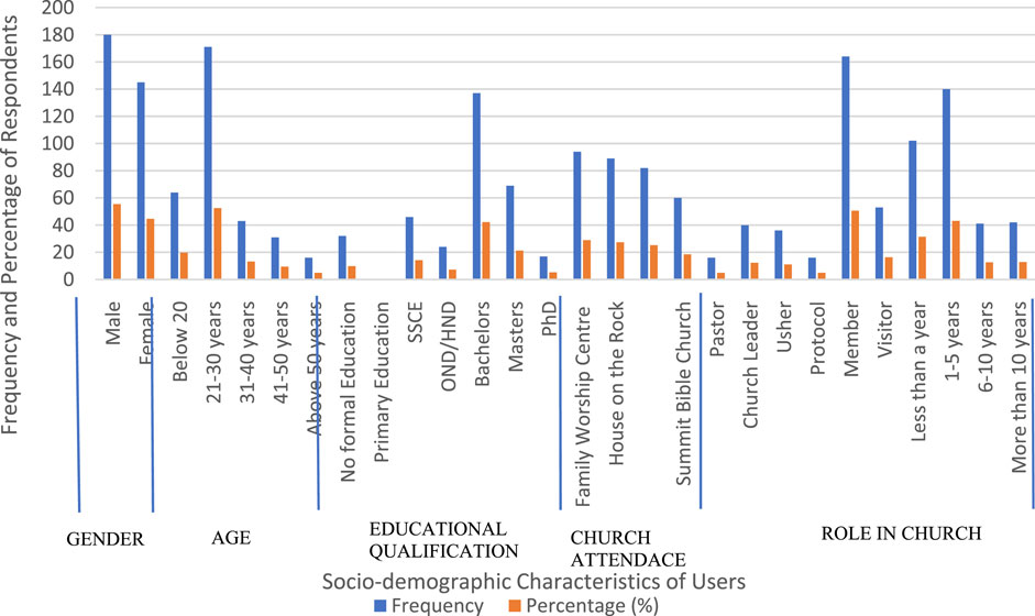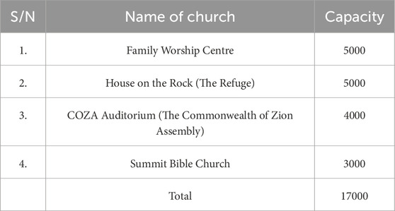 A total of 391 questionnaires were distributed among the selected churches, and a total of 325 filled responses were retrieved, with 94 questionnaires distributed to Family Worship Centre, 89 questionnaires distributed to House on the Rock Assembly, 82 questionnaires distributed to COZA, and 60 questionnaires distributed to Summit Bible Church. The data collection tool was validated through expert review, and the data reliability was verified through reliability checks. Ethical approval was obtained before the survey from the Covenant Health Research Ethics Committee, Covenant University, on the use of human subjects for research. Participants engaged voluntarily with informed consent.