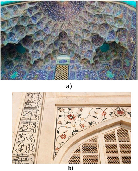 Figure 1. (a) The entry portal of the Sheikh Lotfullah Mosque in Isfahan featuring an arabesque pattern on the Muqarnas. (b) Floral and vegetal arabesques in Pietra dura on a panel of the Taj Mahal, Agra (Alasadi and Hamdy, 2023; Mohammad Arif Kamal, 2020).