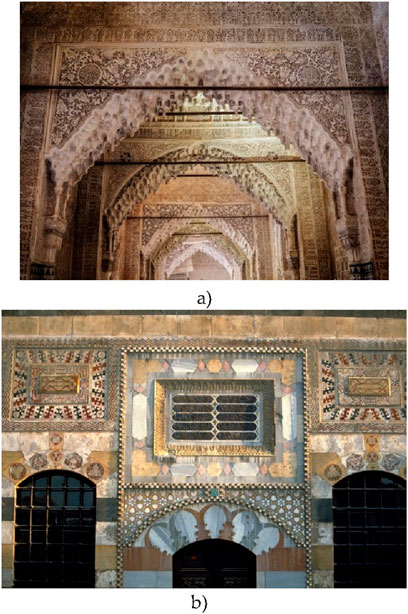 Calligraphy is systematically integrated into the interiors and exteriors of Islamic architectural masterpieces, specifically the Al-Hambra Palace (Spain) and Al-Azem Palace (Syria), as shown in Figure 2. Islamic calligraphy serves both decorative and symbolic functions, reinforcing religious, cultural, and political messages. It reinforces the identity and religious function of public buildings, often inscribed with Quranic verses, Hadith, and wisdom sayings (Baydoun et al., 2024b). It is prominently placed on walls, ceilings, arches, domes, and columns, transforming spaces into spiritual and aesthetic experiences. Traditional Islamic calligraphy adheres to strict rules, such as proportionality, symmetry, repetition, and balance, and uses specific tools including reed pens, handmade ink, and parchment. It is deeply connected to religious architecture, decorating mosques, manuscripts, and royal decrees (Alashari et al., 2020). It follows a structured hierarchical arrangement in Islamic architecture (Kamal et al., 2020):