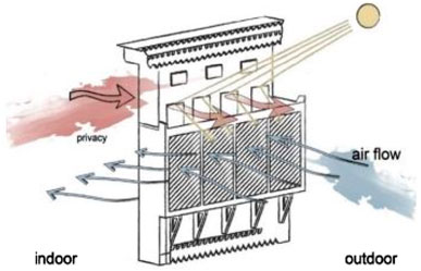 Figure 4. Mashrabiya serves five functions: providing shading, natural ventilation, controlling light passage, reducing air stream temperature and humidity, and providing privacy (Shahda and Nosier, 2021).