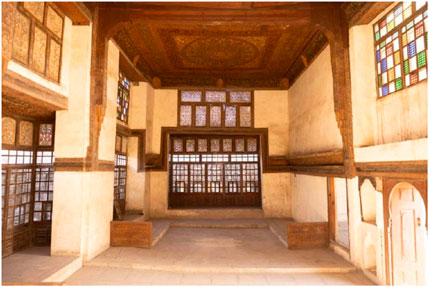 • In the western court yard, there are 4-m-high cornices, as shown in Figure 7, a central fountain, and painted ceilings. The side iwans have mashrabiya galleries, and there is another qa’a and private bath area upstairs.