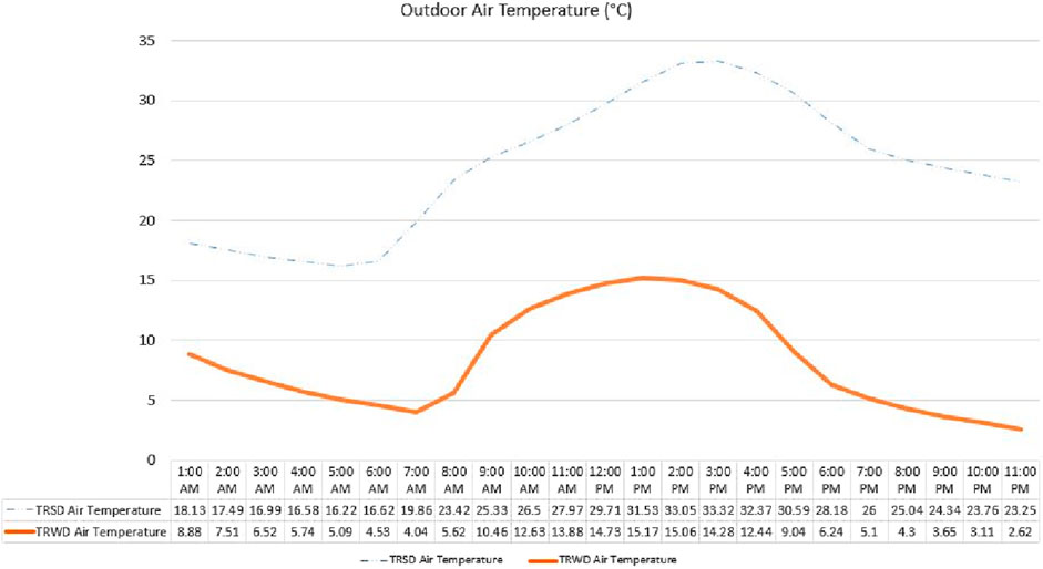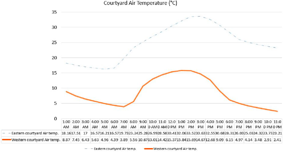 Figure 13. Microclimate simulation comparison of air temperature during typical design days for the eastern courtyard in summer and western courtyard in winter.