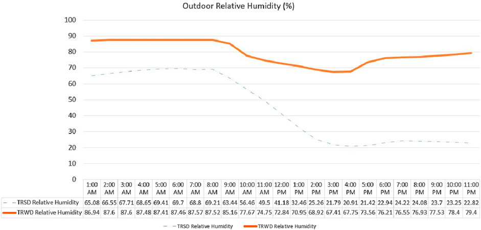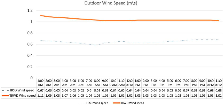 This section presents a practical microclimate simulation for a typical representative summer day, which is 2-6-2025 (TRSD), and a typical representative winter day (TRWD), which is 27-1-2025, based on meteorological parameters. The simulation using ENVI-met V4 was conducted from 1:00 a.m. to 11:00 p.m., covering 23 simulation hours, to produce comparative results for outdoor air temperature, as shown in Figure 8; relative humidity, as shown in Figure 9; wind speed, as shown in Figure 10; mean radiant temperature, as shown in Figure 11; and Physiological Equivalent Temperature (PET) for thermal comfort, as shown in Figure 12. Two inspectors were placed: the first in the northern courtyard (NC) (for summer time) and the second in the southern courtyard (SC) (for winter time), to show the difference between the two courtyards. The results show that Sky View Factor (SVF) is 0.194 in NC and 0.373 in SC, while the air temperatures in NC and SC are compared in Figure 13 to highlight the value of passive design in articulating the courtyard in the inherited courtyard houses.