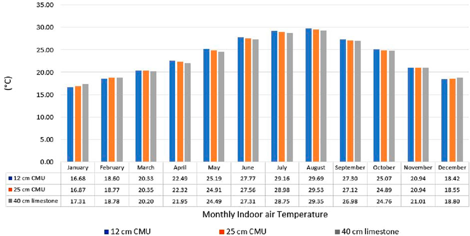 This section is divided into three scenarios with the same data entry, as shown in Table 1. The first scenario used a 12-cm concrete masonry unit, the second scenario used a 25-cm concrete masonry unit, and the third scenario used 40-cm limestone, as shown in Table 1. For all scenarios, the residential template was selected for activity, and natural ventilation was set to 24/7 in the Heating, Ventilation, and Air Conditioning (HVAC) template. The physical properties of these materials are shown in Table 2. The study aims to enhance passive cooling and indoor thermal comfort using Designbuilder V4.2 software. The simulation used a typical meteorological year weather file for Cairo, and the model was set for residential occupancy with natural ventilation enabled 24/7, without mechanical HVAC, to mimic historical use patterns. Each scenario used the same geometry and activity template to isolate the impact of wall materials. The wall materials were chosen to represent traditional (limestone) and contemporary (CMU) construction types. Each material’s thermal properties were defined based on the scientific literature. As shown in Figure 14, the DesignBuilder model of the case study was simulated for a full calendar year to capture seasonal variations.