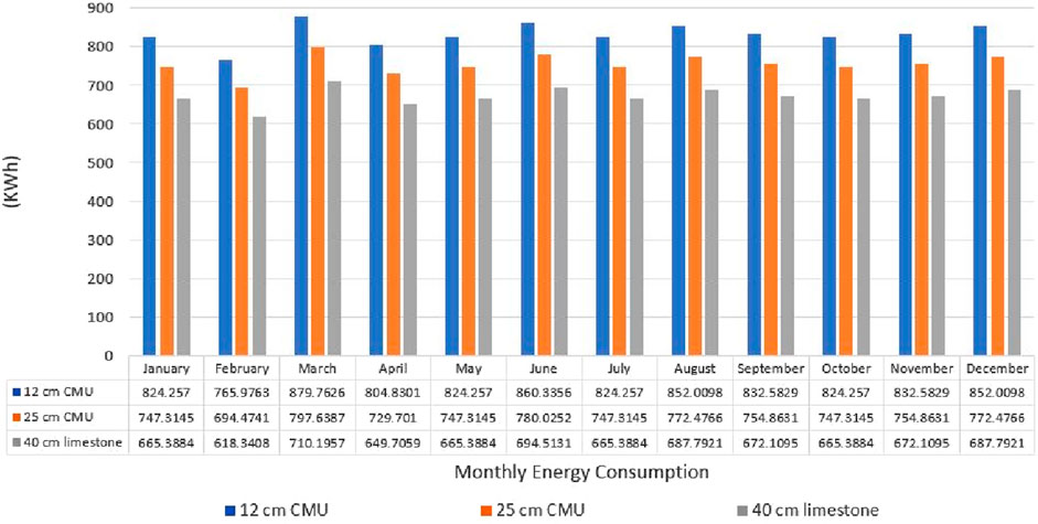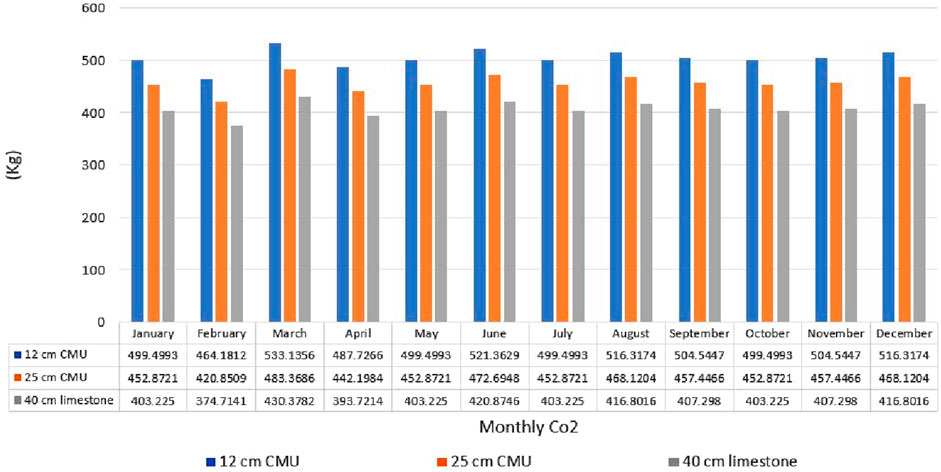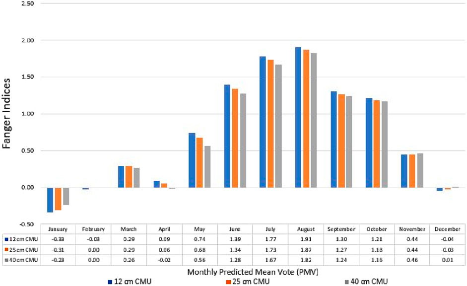 The graphs below show the remarkable effect of using 40-cm limestone for the building envelope as it is considered a great insulator and with good indoor thermal comfort properties. Referring to the indoor air temperature shown in Figure 15, August records the highest temperatures of the year, with reductions of 0.34 °C and 0.18 °C compared to the two case scenarios. Although these absolute differences appear small, they exceed the ASHRAE thermal perception threshold (≈0.2 °C–0.3 °C), making them meaningful for thermal comfort. As shown in Figure 16, carbon dioxide levels peak in March at approximately 69.77 Kg (7.3%), representing reductions of 102.76 Kg (10.9%) compared to the other two materials, with annual reductions of 18.8% and 11.7%, respectively. These values represent energy-related carbon emissions (Kg); calculated using DesignBuilder, not indoor air concentrations (PPM). Overall, the limestone scenario consistently outperformed both CMU scenarios across all months, confirming its potential as a low-emission material solution. Energy consumption, as shown in Figure 17, represents the effect of passive thermal insulation materials and the high thermal mass; the results indicate that 40-cm limestone could be the best option compared to the other two materials, with reductions of 82.12 kWh and 169.56 kWh in the peak month. Predicted Mean Vote (PMV), as a thermal comfort index, clearly demonstrates that the use of limestone positively affects the indoor inhabitants, as shown in Figure 18. It showed improvements of 0.13 and 0.07, corresponding to relative reductions of 17.6% and 10.3% compared to CMU walls. These findings highlight the superiority of traditional limestone construction in maintaining thermal stability and reducing energy use, particularly in peak summer months. This underscores the effectiveness of passive cooling strategies historically embedded in Islamic architecture and their relevance for modern sustainable building design. It demonstrates not only statistical differences but also practical significance as reductions in energy use, CO2 emissions, and comfort indices scale to meaningful impacts when extrapolated to the building stock of historic Cairo.