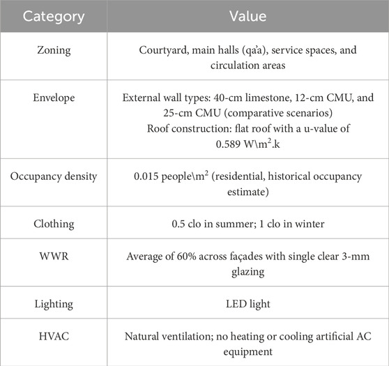 Although this study highlights the environmental performance of traditional limestone construction in Bayt Al-Razzaz and situates arabesque ornamentation within its cultural and environmental context, several limitations should be acknowledged. The quantitative simulation focused exclusively on wall materials and did not parametrically model arabesque screens, mashrabiyas, or calligraphic ornament in terms of porosity, shading coefficients, or daylighting impacts. These elements were addressed through a literature review rather than direct analysis. Moreover, the model is idealized, which may not fully capture the irregularities and details of the historic building. Despite this limitation, the study provides a valuable foundation for future research that could incorporate parametric modeling of arabesque elements and comparative multi-case analyses.