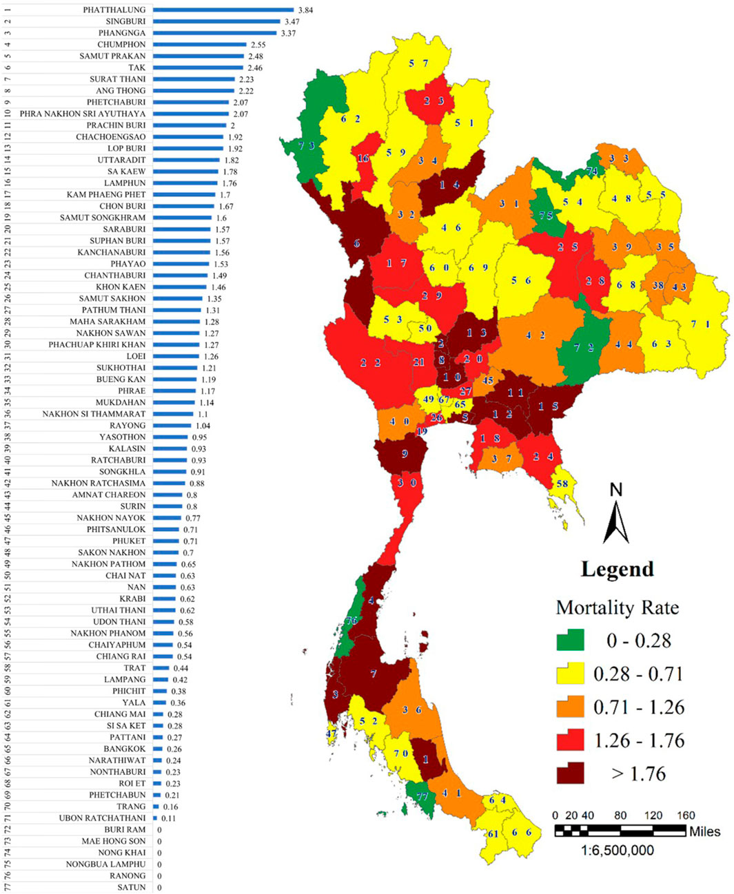 Beyond temporal fluctuations, spatial disparities are also evident. Figure 2 illustrates the provincial-level fatality rates per 100,000 population across Thailand, revealing substantial spatial disparities in road traffic risk. To effectively illustrate these variations, the fatality rates are categorized into distinct ranges using percentile divisions. This methodological approach not only highlights absolute differences but also clarifies each province’s relative position within the national spectrum of risk. Provinces with high fatality rates (exceeding 1.76 deaths per 100,000 population) tend to cluster in specific regions, while others report zero fatalities. These variations may reflect differences in geographic conditions, data reporting systems, law enforcement rigor, or road user behavior across regions. Such disparities underscore the uneven distribution of road safety risks nationwide and highlight the necessity of integrating spatial-level factors with individual-level driving behaviors. A more systematic, multilevel approach is therefore essential to uncover the underlying mechanisms shaping the severity of traffic crashes.