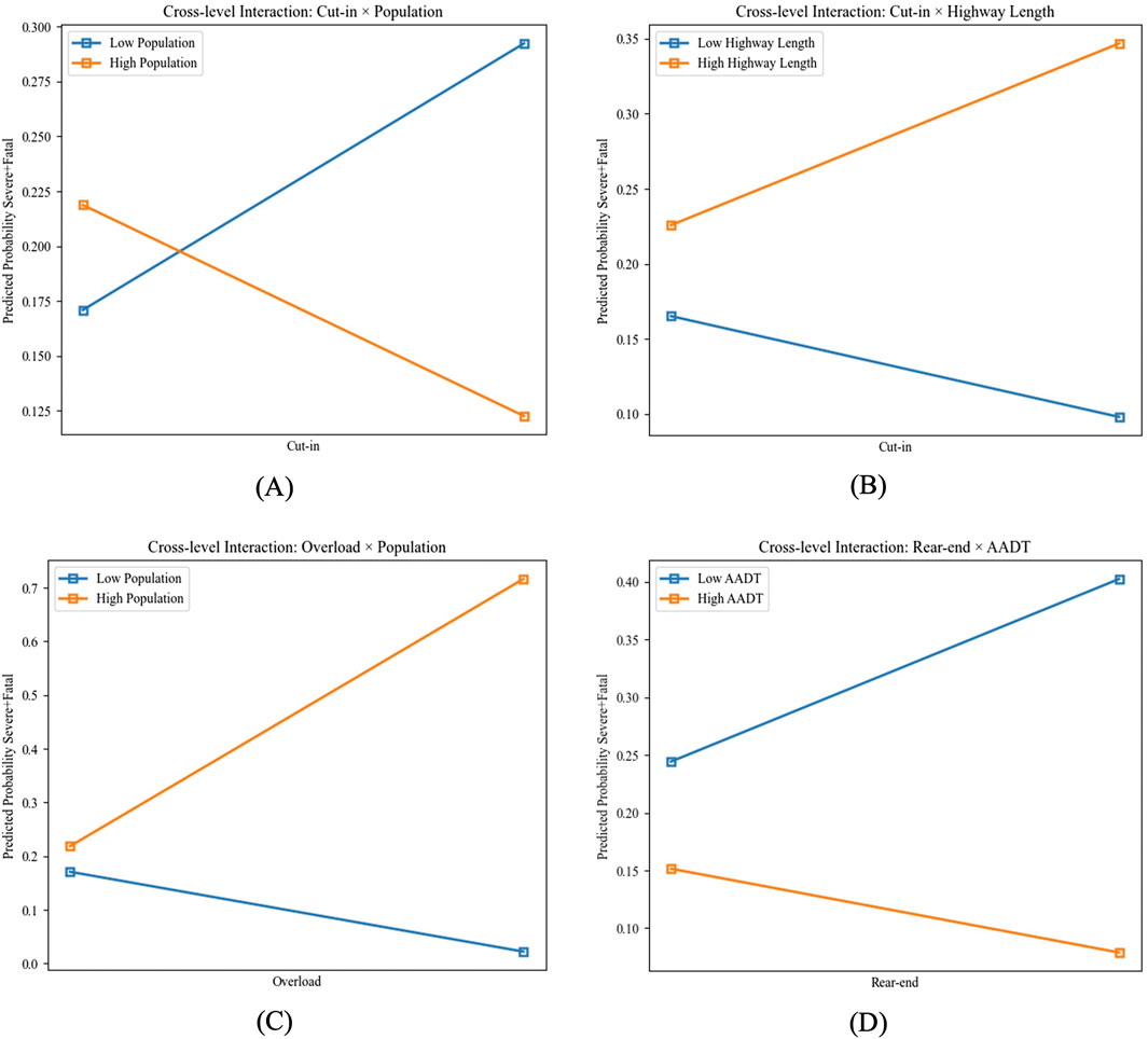 Figure 4. Cross-level interaction effects from the multilevel ordered logit models. (A) Cut-in × Population: severity decreases in high-population areas, (B) Cut-in × Highway Length: severity increases with longer distance, (C) Overload × Population: severity rises in high-population areas, (D) Rear-end × AADT: severity decreases with higher traffic volume.