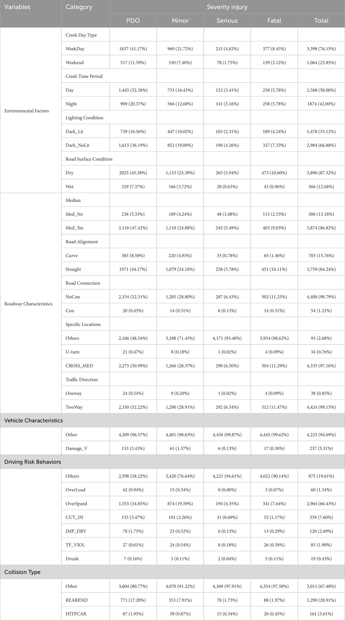 Environmental Factors, Environmental conditions at the time of the crash play a critical role in determining injury severity. Crashes occurring during weekends, nighttime hours (Behnood and Al-Bdairi, 2020; Habib et al., 2025; Champahom et al., 2023; Wang et al., 2019), or in poorly lit areas often reflect temporal and spatial contexts where changes in driver behavior and roadway conditions are more pronounced (Uddin and Huynh, 2018; Wei et al., 2022; Hao et al., 2016; Habib et al., 2025; Azimi et al., 2022; Uddin and Huynh, 2020). Furthermore, road surface conditions such as dry versus wet pavement may influence vehicle traction and visibility, thereby affecting crash outcomes (Habib et al., 2024; Yu et al., 2022; Chen et al., 2015; Champahom et al., 2023; Chen and Chen, 2011).