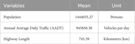 In addition to individual-level characteristics, provincial-level contextual factors were incorporated as Level-2 predictors to account for regional variation in crash severity. Table 2 summarizes the provincial-level variables used as Level-2 contextual predictors in the multilevel analysis. These include total population (National Statistical Office of Thailand, 2022), annual average daily traffic (AADT) (Bureau of Highway Safety, 2022b), and total Highway Length (Bureau of Highway Safety, 2022a) under the jurisdiction of the Department of Highways. The mean values indicate that, across all provinces, the average population was approximately 14.44 million people, the average daily traffic volume was about 945,850 vehicles, and the average Highway Length was 745.39 km per province. These variables provide important contextual information for capturing inter-provincial variation in crash severity.