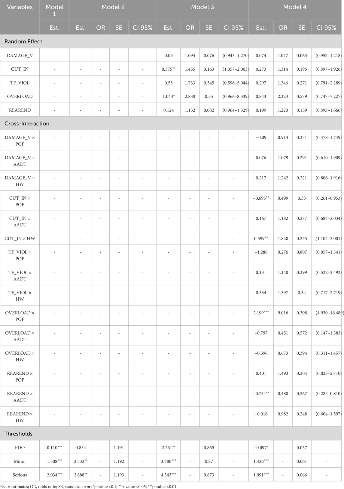 To comprehensively capture both direct effects and cross-level contextual influences, this study adopts a stepwise modeling strategy comprising four hierarchical models, progressing from a basic to a more complex structure. This modeling approach aligns with prior empirical studies such as Chen et al. (2015), who employed a hierarchical Bayesian multinomial logit model to examine truck driver injury severity in rural crashes, explicitly incorporating cross-level interaction effects. Similarly, Chen et al. (2016) utilized a hierarchical ordered logit model that integrated crash-level random effects to account for within-crash correlations and between-crash heterogeneity, emphasizing the importance of acknowledging the nested structure commonly found in traffic safety data.