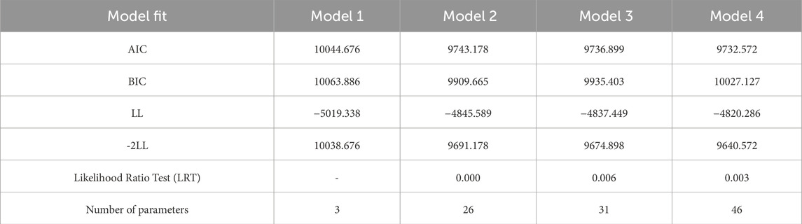 Beyond parameter estimation, model fit indices such as the Akaike Information Criterion (AIC), Bayesian Information Criterion (BIC), and the −2 Log-Likelihood (-2LL) offer valuable insights into the explanatory performance of the models developed. From Model 1 to Model 4, both AIC and -2LL consistently declined (e.g., from 10,044.676 to 10,038.676 in Model 1 to 9,733.306 and 9,640.572 in Model 4), suggesting improvements in model fit and a reduction in residual deviance as model complexity increased.