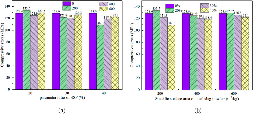 Figure 3. Effect of fineness and content of steel slag powder on compressive strength of UHPC. (a) Fineness of SSP. (b) Proportion of SSP.