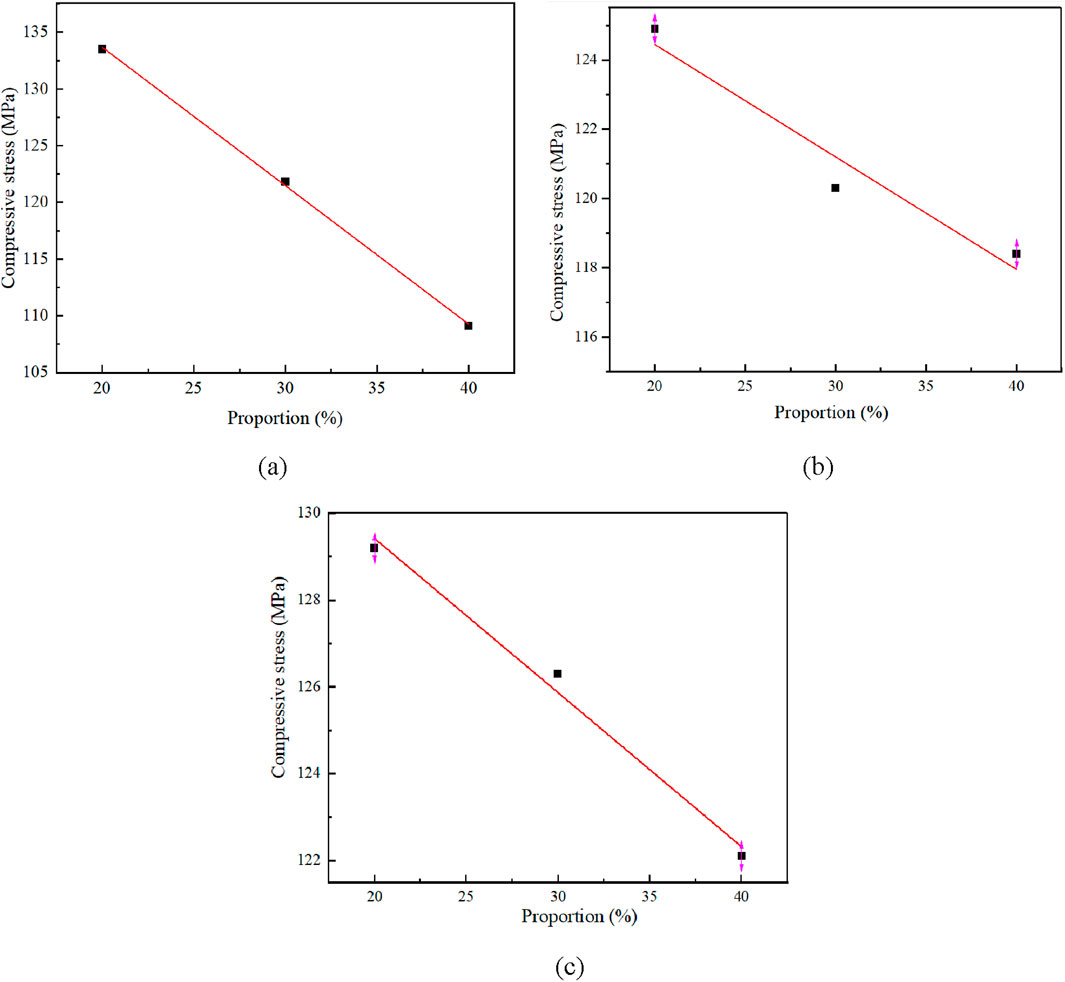 Figure 4 presents the fitting curves depicting the relationship between SSP dosage and the compressive strength of UHPC at various fineness levels. It can be observed that for each fineness level, the compressive strength of UHPC decreases linearly with increasing SSP dosage. The correlation coefficients (R2) of the fitted linear functions all exceed 0.9, indicating strong linear correlations and excellent fitting performance.