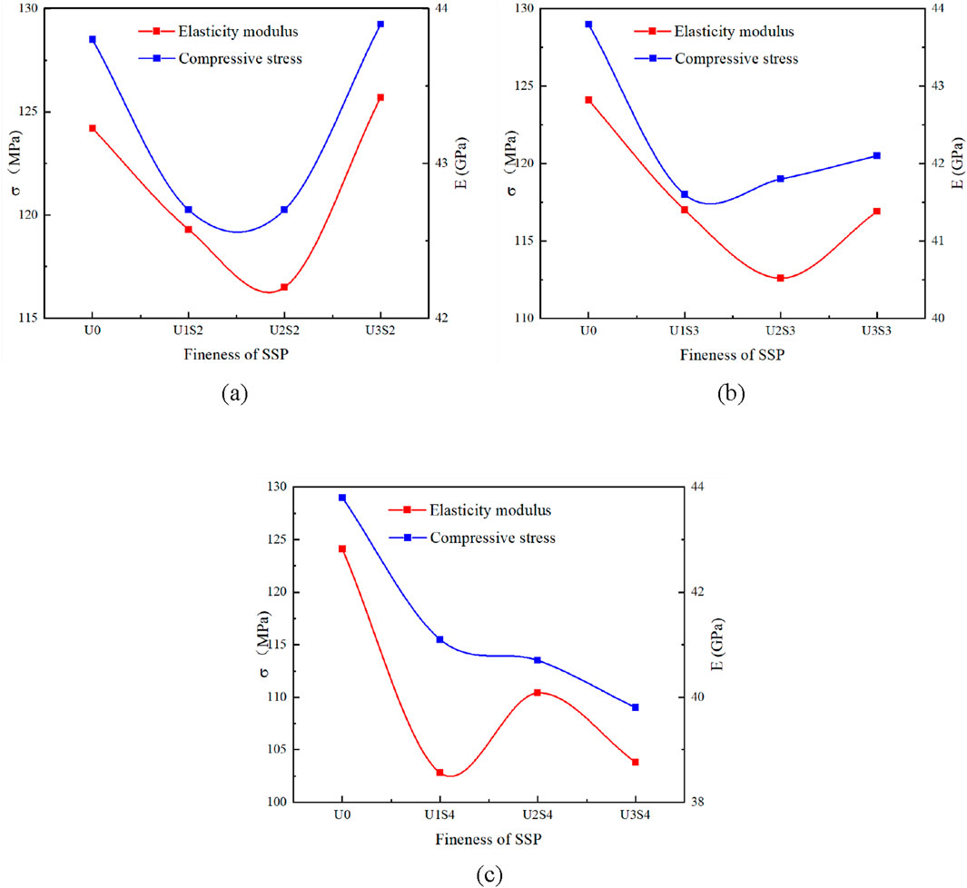 Figure 5. Effect of fineness and content of SSP on axial compressive strength and elastic modulus of UHPC. (a) 20% SSP. (b) 30% SSP. (c) 40% SSP.